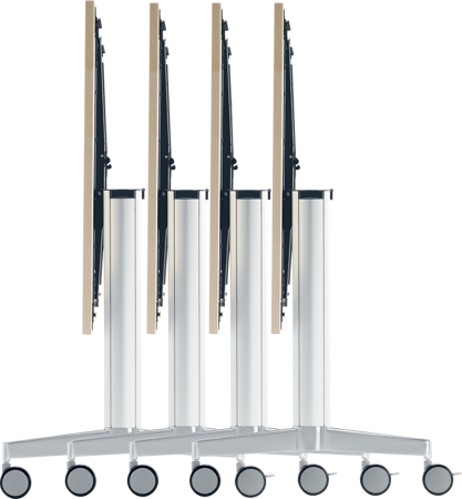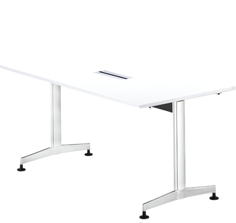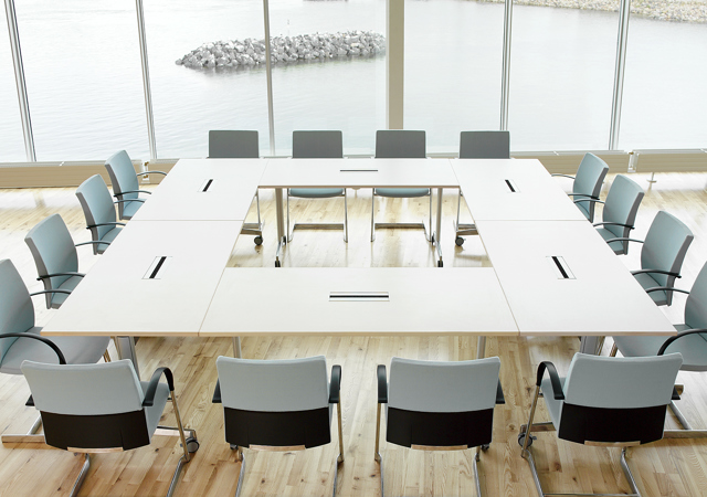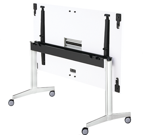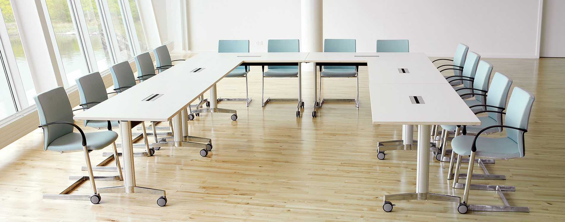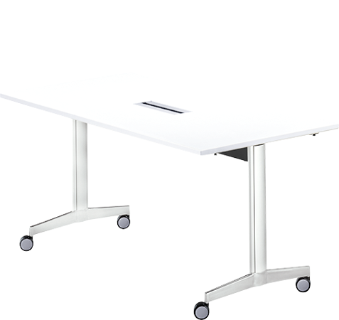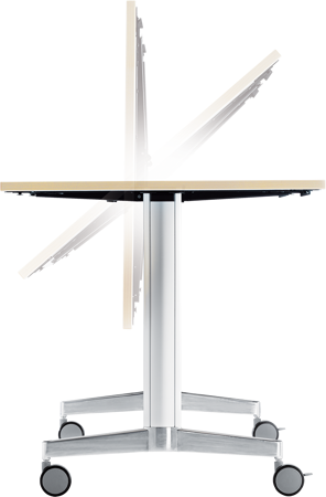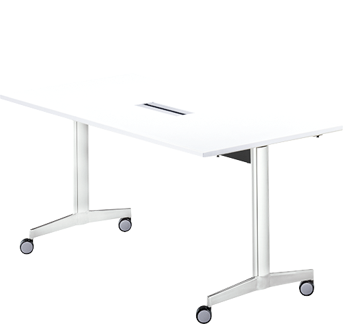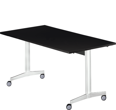 Moveo is a mobile flip-top table system for training, meeting, and conferencing use with an integrated solution for concealed cabling. Inverted T-leg style. Rectangular, half-round, or V-shape tabletops in several sizes. Tables can be nested when not in use.