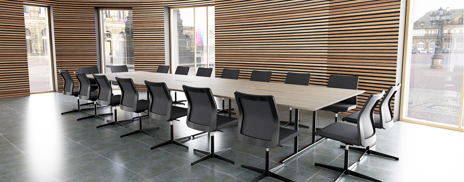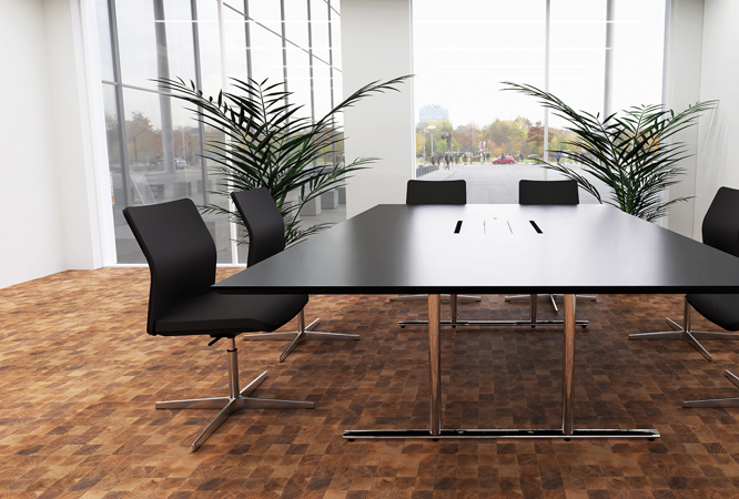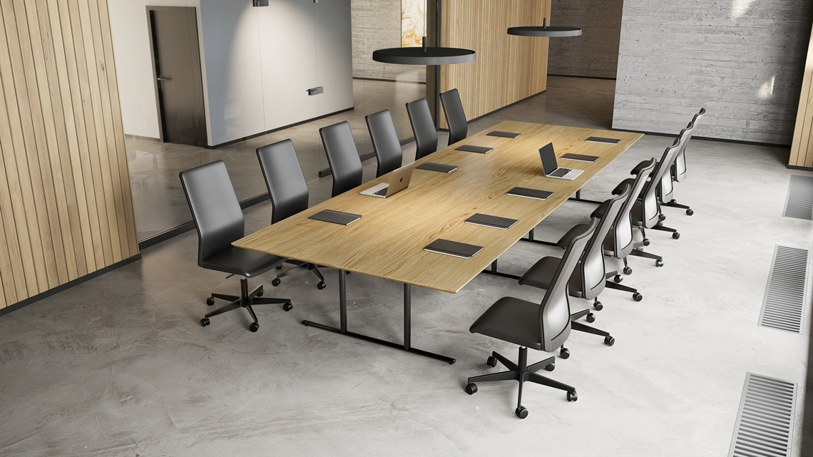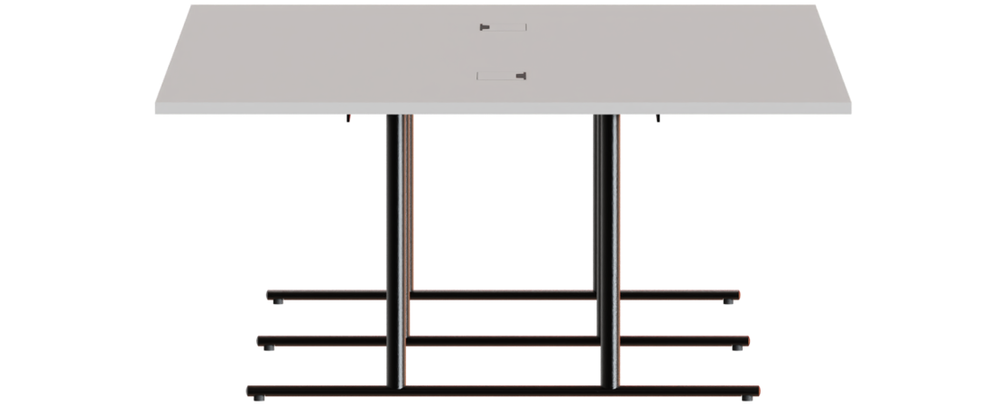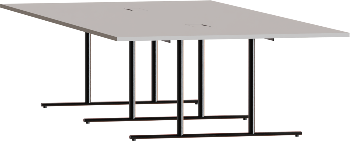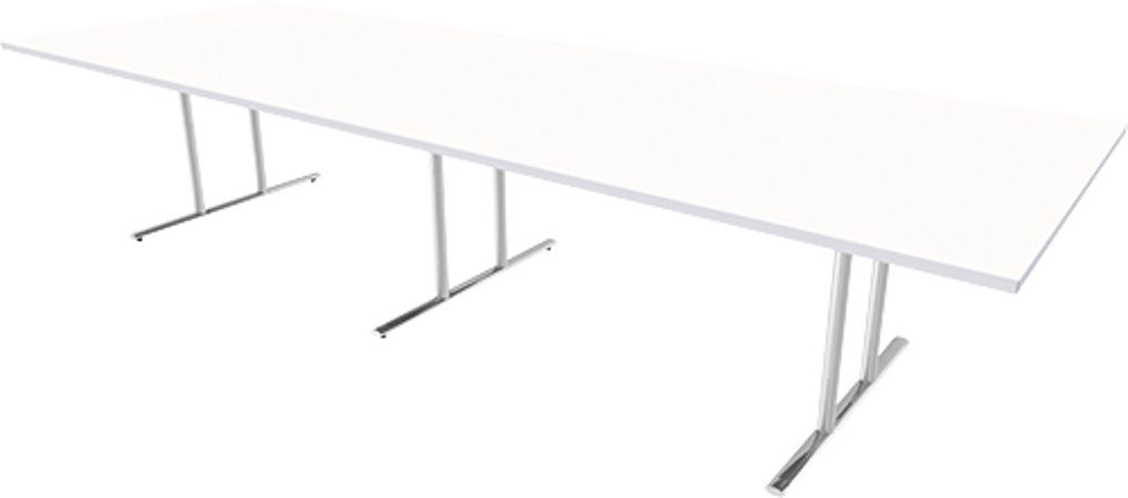 The legs are shared to minimize cost. The standard concept accommodates up to 26 seats with plenty of space for movement. The double T leg design are fixed and with adjustable glides. Available as rectangular and boatshape.