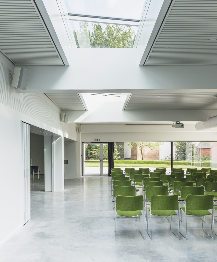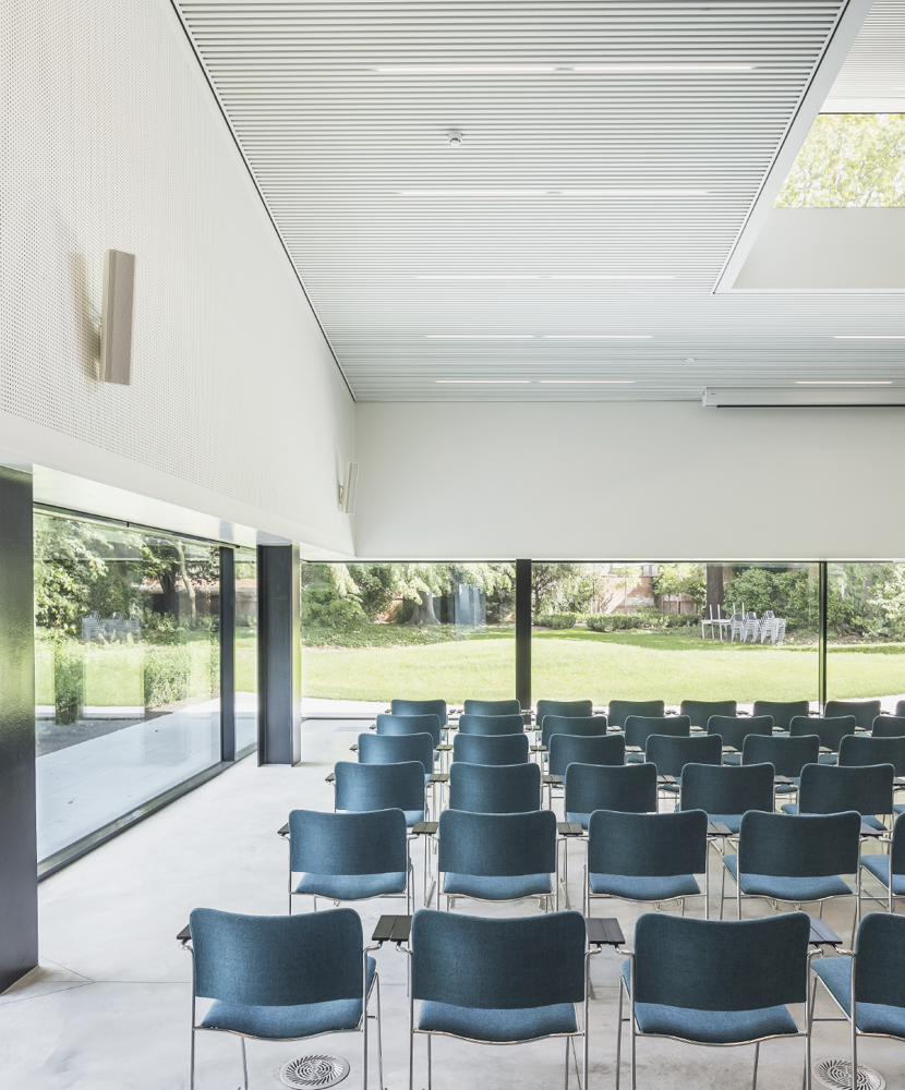KAVA is a project in the city center of Antwerp. The existing building was extended with new offices, and new meeting and auditorium spaces.