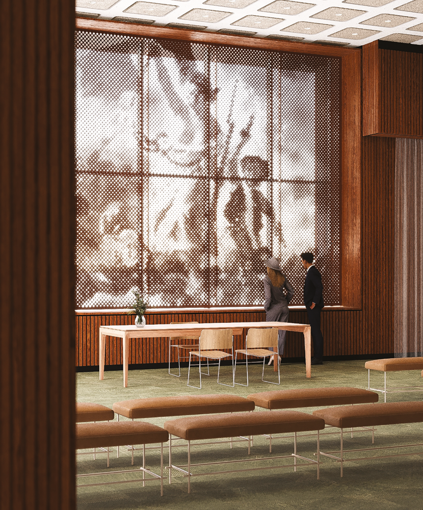 Closely connected yet distinct in use, the two rooms are conceived to function independently or as a single, coherent space. During city assemblies, the Wedding room transforms into a public seating area, placing high demand on furniture that can be moved, stored, and reconfigured efficiently.