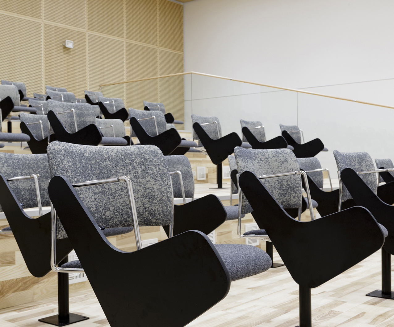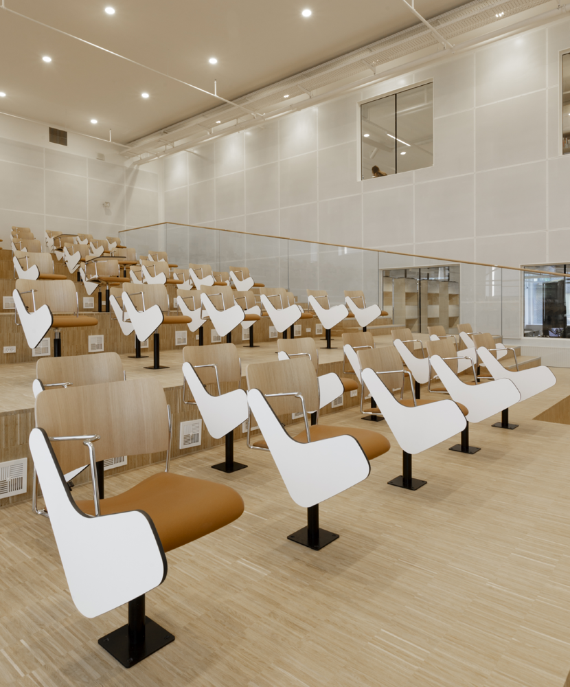 For this project, HOWE delivered 600 40/4 chairs in several different versions to the new campus, most of which were customized auditorium chairs. But JJW Architects, whose team we were supporting, not only needed an auditorium chair with an attached foldaway writing table, they needed a chair that could come in many fabrics and finishes.